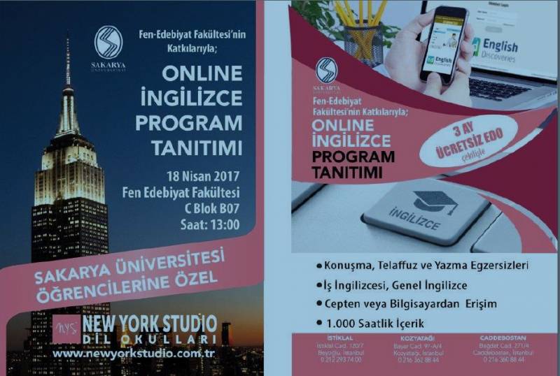 Fakültemizin katkılarıyla New York Studıo Dil Okulları tarafından SAÜ öğrencilerine özel "Onlıne İngilizce Program Tanıtımı", 18 Nisan 2017 Salı günü saat 13:00'te Fakültemiz C Blok B07 nolu salonda gerçekleştirilecektir.